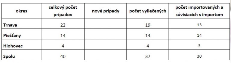 Regionálny úrad verejného zdravotníctva so sídlom v Trnave oznamuje, že v rámci svojej pôsobnosti okresy Trnava, Hlohovec a Piešťany eviduje tieto osoby s potvrdeným ochorením na COVID – 19 spôsobeným koronavírusom SARS-CoV-2: