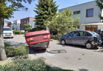 Záchranné zložky zasahujú na Vodárenskej ulici v Piešťanoch. Vodič červenej Škody Felicia nezvládol riadenie a s autom skončil na streche.