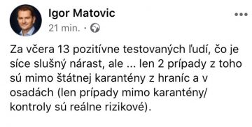 „Za včera 13 pozitívne testovaných ľudí, čo je síce slušný nárast, ale len 2 prípady z toho sú mimo štátnej…