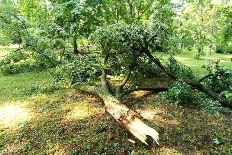 Na Banke pri škôlke v amfiteátri padla krásna lipa. „Pod Červenou vežou na mňa padol veľký konár, na Banke roztrhol elektrické vedenie a strom pod vežou sa zrútil na cestu,“ informovala nás čitateľka. Išla, našťastie, autom, takže zrejme si to odnieslo skôr jej auto.