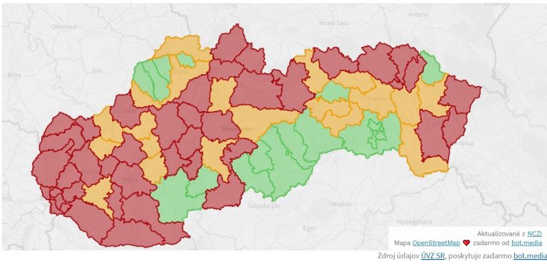 V okrese Tvrdošín zaznamenali hygienici 54 prípadov, v okrese Bratislava 52 a v okrese Bardejov 50. Okres Nové Zámky eviduje 40 nových infikovaných, okres Prievidza 38, okres Námestovo 34, okres Trnava 27, okres Banská Bystrica 23 a okres Svidník 22. V okresoch Nitra a Topoľčany pribudlo 19 prípadov, v okrese Liptovský Mikuláš 17, v okresoch Sobrance, Trebišov a Žilina 16. Pozitívny výsledok testov malo 15 ľudí v okrese Humenné, 12 v okrese Košice, po 11 v okresoch Komárno a Prešov. Desať prípadov majú okresy Galanta, Malacky a Spišská Nová Ves, deväť Michalovce, Senec a Stará Ľubovňa. Osem infikovaných zaznamenali v okresoch Brezno, Dolný Kubín a Stropkov, sedem v okresoch Myjava, Poprad a Snina a šesť v okresoch Lučenec, Martin, Piešťany a Trenčín.