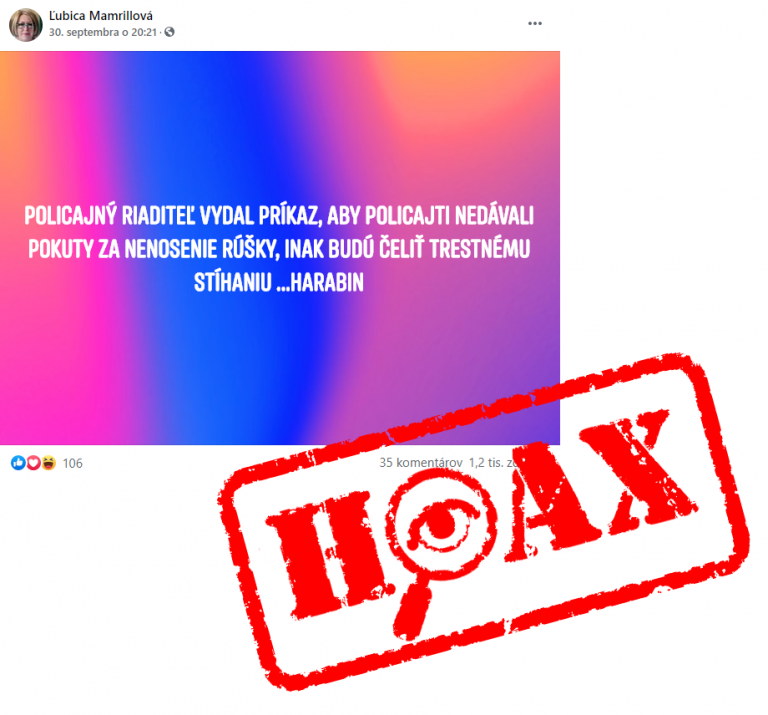 Polícia upozorňuje na status o neudeľovaní pokút za nenosenie rúšok. Informuje o tom prostredníctvom sociálnej siete na stránke Hoaxy a podvody – Polícia SR. V statuse sa uvádza, že policajný riaditeľ vydal príkaz policajtom, aby nedávali pokuty za nenosenie rúšok.