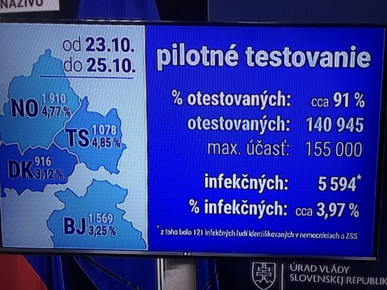 Premiér Igor Matovič (OĽaNO) zverejnil definitívne čísla plošného testovania v okresoch, ktoré pandémia nového koronavírusu zužuje najviac. Celkovo bolo urobených 140 945 testov a z nich vyšlo 5 594 ľudí ako infekčných. Predstavuje to 3,97 percenta infekčných ľudí z celkového čísla prevedených testov.