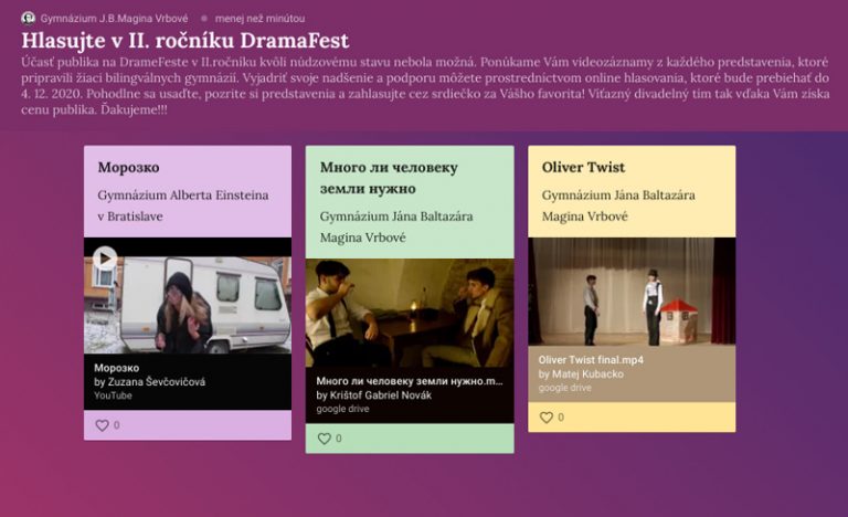Pohodlne sa usaďte, pozrite si predstavenia a zahlasujte za vášho favorita! Víťazný divadelný tím vďaka vám získa cenu publika. Hlasovať môžete na: padlet.com/gymnaziumvrbove/c0xokm4sv4dijs1d.