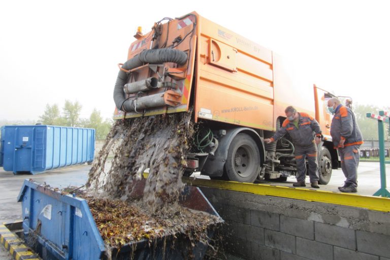 Kým sme všetko pobehali a nafotili, už s cisternou plnou starého lístia prišlo ďalšie zametacie vozidlo. Vodič zatiahol na vyššiu šikmú rampu, otvoril zadný príklop a lístie pomiešané s dažďovou vodou sa sypalo do obrovského kontajnera. Dvaja pomocníci ešte dohliadali na jeho vyprázdnenie a pomáhali lístiu vypratať sa zo zásobníka.