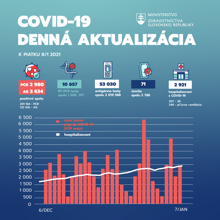 Na Slovensku za uplynulý deň pribudlo 2 980 pozitívne testovaných ľudí formou RT-PCR testov a 3 634 pozitívne testovaných antigénnymi testami. Je to 27,96 % z 10 657 ukončených RT-PCR vyšetrení a 6,85 % z 53 030 antigénnych testov za včerajší deň.