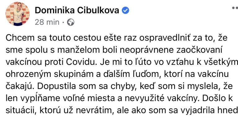 Chcem sa touto cestou ešte raz ospravedlniť za to, že sme spolu s manželom boli neoprávnene zaočkovaní vakcínou proti Covidu. Je mi to ľúto vo vzťahu k všetkým ohrozeným skupinám a ďalším ľuďom, ktorí na vakcínu čakajú. Dopustila som sa chyby, keď som si myslela, že len vypĺňame voľné miesta a nevyužité vakcíny. Došlo k situácii, ktorú už nevrátim, ale ako som sa vyjadrila hneď na začiatku, ponúkam svoju pomoc. Chcem využiť ponuku Ministerstva zdravotníctva, aby som ako dobrovoľníčka pomohla v prvej línii a v tejto veci som už MZ kontaktovala.