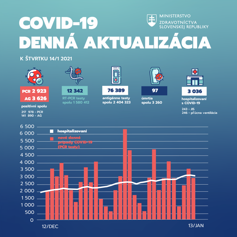 Na Slovensku za uplynulý deň pribudlo 2 923 pozitívne testovaných ľudí formou RT-PCR testov a 3 626 pozitívne testovaných antigénnymi testami. Je to 23,68 % z 12 342 ukončených RT-PCR vyšetrení a 4,75 % z 76 389 antigénnych testov za včerajší deň.