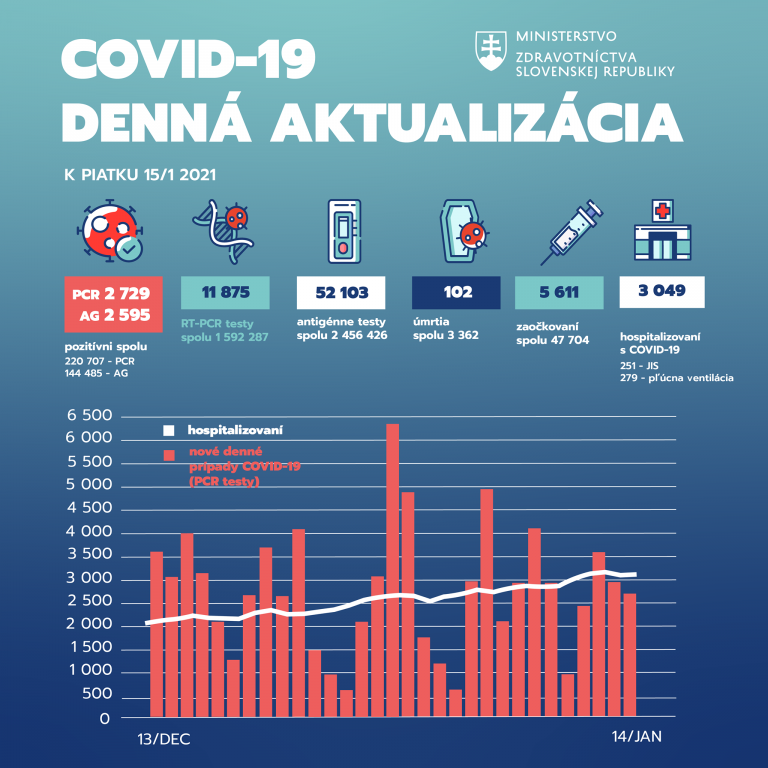 Z laboratórnych PCR testov malo na Slovensku pozitívne výsledky už vyše 220-tisíc osôb, z antigénových viac ako 144-tisíc. Celkový počet úmrtí „na COVID“ je 3 362 a celkový počet úmrtí „s COVIDom“ je 702. Z ochorenia sa zotavilo vyše 163-tisíc nakazených.