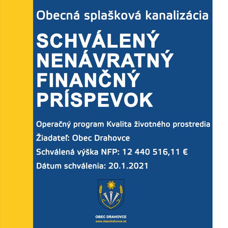 Obec Drahovce získala nenávratný finančný príspevok z eurofondov vo výške 12,4 milióna eur na vybudovanie kanalizácie. Ministerstvo životného prostredia zmenilo svoje rozhodnutie spred piatich rokov a peniaze obci pri Piešťanoch schválilo. O pridelení peňazí informoval starosta Drahoviec Miroslav Ledecký. Obec podľa neho celú čiastku z operačného programu zameraného na kvalitu životného prostredia ani nevyčerpá, pretože kanalizácia bude výrazne lacnejšia.