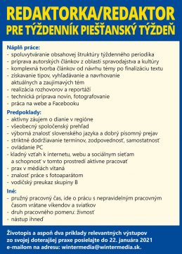 Ak si kreatívny, zaujíma ťa dianie v regióne, máš už s podobnou prácou skúsenosti radi ťa v našom kolektíve privítame.…