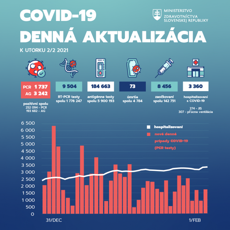 V pondelok odhalili PCR testy na Slovensku ďalších 1 737 nakazených koronavírusom. Laboratóriá otestovali 9 504 vzoriek. Počet úmrtí pacientov na COVID-19 sa zvýšil o 73. Vyliečilo sa ďalších 3 719 osôb.