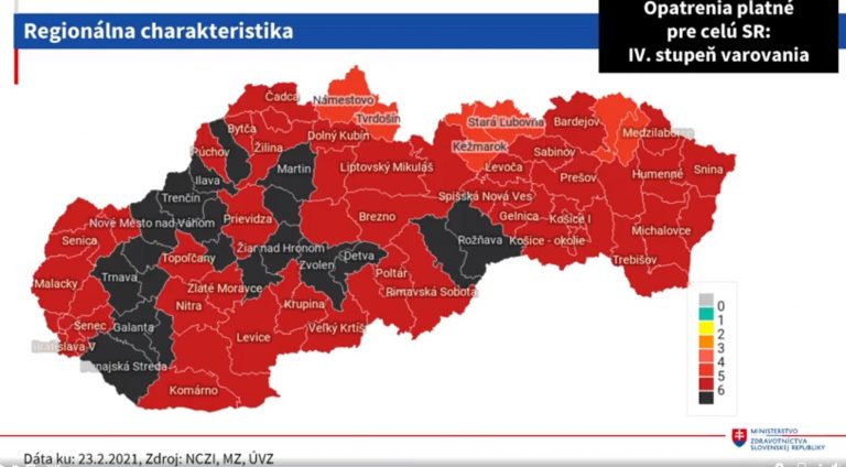 Z pohľadu regiónov počet okresov v štvrtom, teda v čiernom stupni varovania stúpne na 20. Ide o okresy Bánovce nad Bebravou, Detva, Dunajská Streda, Galanta, Hlohovec, Ilava, Martin, Nové Mesto nad Váhom, Partizánske, Piešťany, Považská Bystrica, Revúca, Rožňava, Šaľa, Trenčín, Trnava, Turčianske Teplice, Žarnovica, Žiar nad Hronom a Zvolen. V treťom – bordovom stupni bude 53 okresov. V druhom stupni varovania – červenom bude šesť okresov.