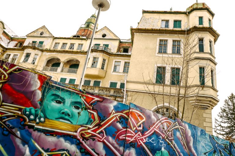 Čo je väčšia hanba? Pomaľovaný a postriekaný plot, ktorý grafiťáci premenili na viac-menej vkusnú pouličnú galériu, alebo kedysi jeden z najkrajších hotelov široko-ďaleko, ktorý už vyše 30 rokov chátra? (Autor: Juraj Sedlák)