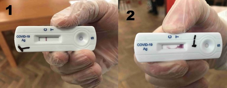 V odberných miestach v regióne sa trápia s chybovými Ag testami. Na obrázku 1 je správne vyhodnotenie vykonaného testu. Na obrázku 2 je ich najčastejšia chyba. Testovacie políčko sa buď celé, alebo časť z neho nejasne vyfarbí do bordova, pričom z takého testu sa nedá nič vyčítať. Nejedného zo záujemcov tak tento víkend čaká niekoľkonásobné opakovanie testu. Presne to sa reálne udialo aj počas našej prítomnosti na testovacom mieste.
