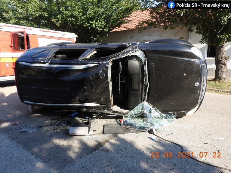 Po náraze na streche skončilo auto Ssangyong. Nehoda sa stala na križovatke ulíc J. Sambucusa a Štúrova v Trnave. 45 ročná vodička Škody Octavia pravdepodobne nedala pri vychádzaní z vedľajšej cesty prednosť autu Ssangyong Rexton, ktoré išlo po hlavnej. V aute sa okrem 36 ročného vodiča viezli 4 osoby, z toho jedno iba 4 ročné dieťa. Všetci spolujazdci z čierneho auta sa zranili. Policajti vodičke na mieste zadržali vodičský preukaz.