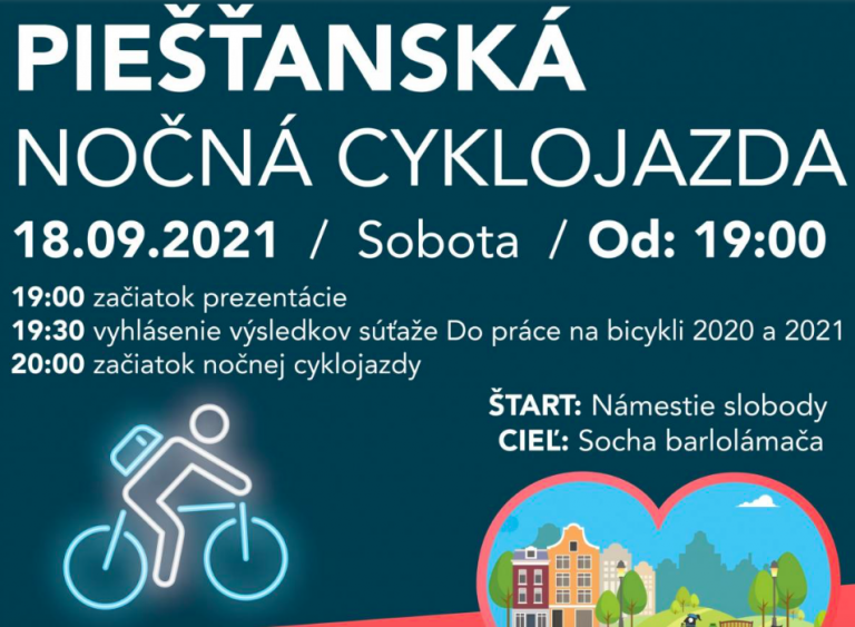 Posledná tohtoročná nočná cyklojazda sa uskutoční zajtra 18. septembra. Registrácia je od 19.00hod so štartom o 20.00hod na Námestí Slobody. Trasa dlhá 7 kilometrov je vhodná aj pre deti.