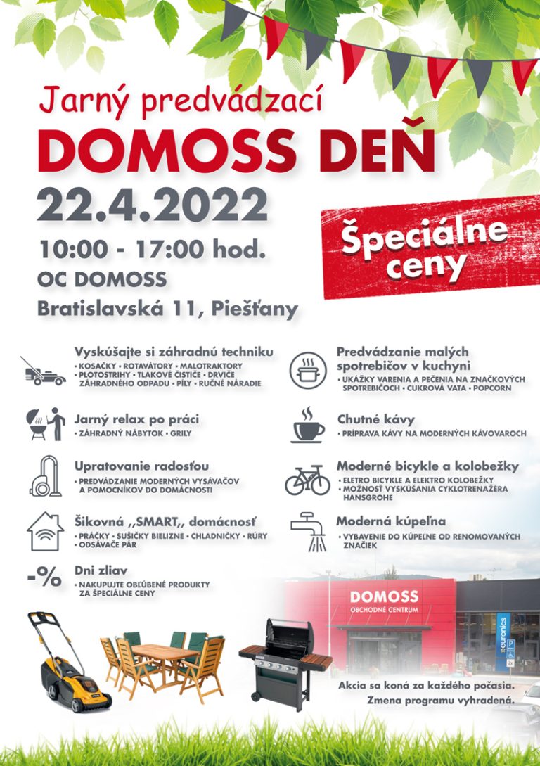 Jar je v plnom prúde a to znamená, že je skvelý čas na nové začiatky. Svieži vzduch a slnečné počasie volá do záhrad, v ktorých na nás nečaká len práca, ale aj príjemné posedenia s priateľmi. V domácnostiach sa začína jarné upratovanie a podmienky na šport v prírode sú priam ideálne. Všetky tieto aktivity sa robia lepšie a ľahšie, ak máte k dispozícii tých správnych pomocníkov. Na Jarnom predvádzacom DOMOSS dni, ktorý sa koná v piatok 22. apríla v predajni DOMOSS na Bratislavskej ceste v Piešťanoch, nájdete množstvo inšpirácie, ako si vniesť do každodenného života nový vzduch.