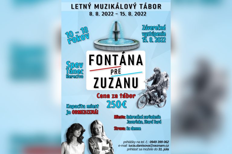 Organizátori muzikálového tábora, ktorý sa toto leto ponesie v štýle Fontány pre Zuzanu, majú dobrú správu. Na tábore zostalo pár voľných miest, a tak sa chlapci i dievčatá vo veku 10-18 rokov môžu ešte stále prihlásiť.