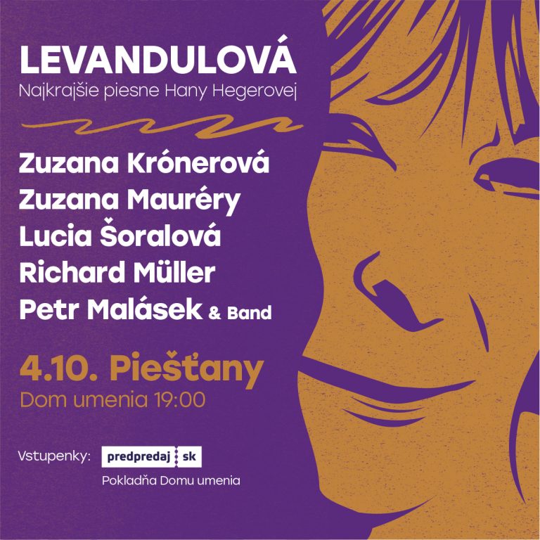 V programe Levandulová, ktorý do Domu umenia Piešťany prichádza prvý októbrový utorok, zaznejú v prevažnej miere piesne z repertoáru prvej dámy česko-slovenského šansónu Hany Hegerovej, ale aj ďalšie nádherné piesne z autorskej dielne Petra Hapku a Michala Horáčka. Tešiť sa môžete na mená ako Zuzana Krónerová, Zuzana Mauréry, Lucia Šoralová, Richard Müller či Petr Malásek so sprievodnou kapelou.