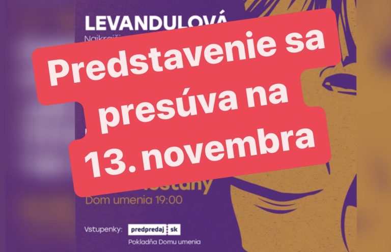 Dom umenia Piešťany s poľutovaním oznamuje, že dnešné predstavenie LEVANDULOVÁ – Najkrajšie piesne Hany Hegerovej sa prekladá na 13. novembra o 19.00 h.