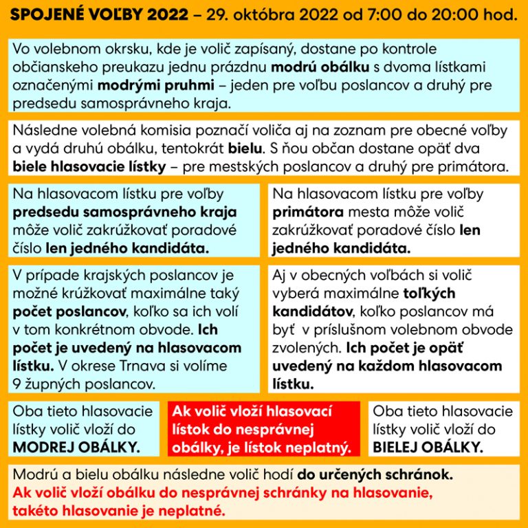 V nadchádzajúcich spojených komunálnych a krajských voľbách v sobotu 29. októbra bude možné hlasovať v čase od 7.00 do 20.00 h. Ide pritom o rozdiel oproti parlamentným voľbám, keď sa zvykne hlasovať do 22.00 h. Pokiaľ ide o začiatok hlasovania, rozhodnutím starostu obce je ho možné posunúť na skorší čas, maximálne však o dve hodiny. Volič nie je povinný v spojených komunálnych voľbách a voľbách do orgánov vyšších územných celkov hlasovať v oboch hlasovaniach.