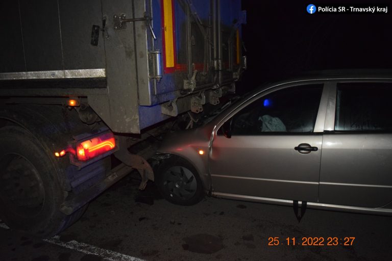 V piatok v noci privolali policajtov k dopravnej nehode medzi Veľkými Kostoľanmi a Drahovcami v okrese Piešťany. 26-ročný vodič pravdepodobne nesledoval situáciu na ceste a s autom Škoda Fabia zozadu narazil do návesu nákladného auta. To stálo a dávalo prednosť pracovnému stroju, ktorý vychádzal z poľa. Policajti podrobili oboch vodičov dychovým skúškam, vodič Fabie nafúkal 1,71 promile, pri opakovanej skúške hodnota dokonca stúpla až na 1,92 promile.