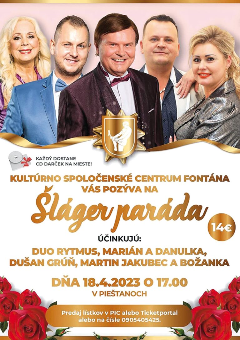 Šláger paráda, známa z obrazovky TV Šláger, v ktorej bude účinkovať hviezda šlágrov pri príležitosti jej životného jubilea, 80 rokov, maestro Dušan Grúň, ďalej populárny spevák a moderátor Martin Jakubec, ktorý je v Piešťanoch obľúbený, tiež speváčka jadranských hitov Božanka a skupina Duo Rytmus, milí manželia Marián a Danulka, sa na vás už teraz tešia. Najznámejšie hity Dušana Grúňa, zlaté šlágre, piesne mora, ale aj ľudové a veselé melódie pri príležitosti solidarity medzi generáciami navzájom odznejú na tomto krásnom kultúrnom podujatí. Vstupenky sú k dispozícii do vypredania v PIC.
