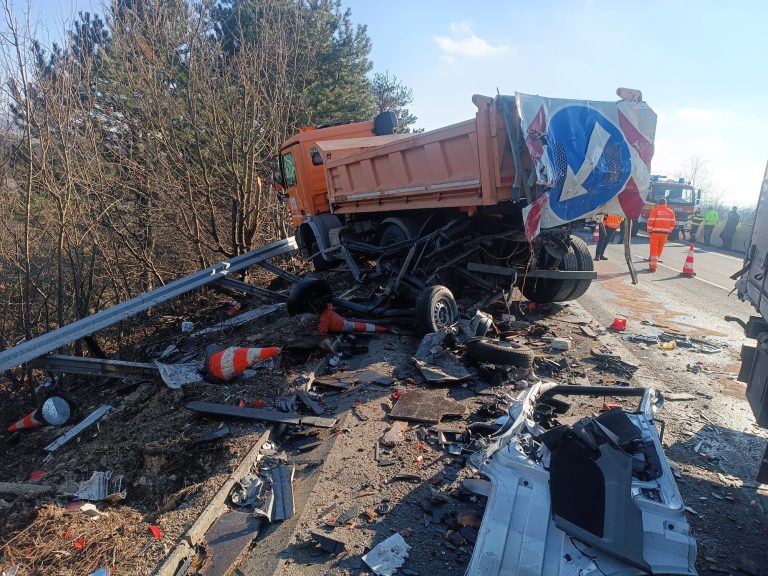 Vážna nehoda na diaľnici D1 pred Hlohovcom, do cestárskeho auta narazil kamión