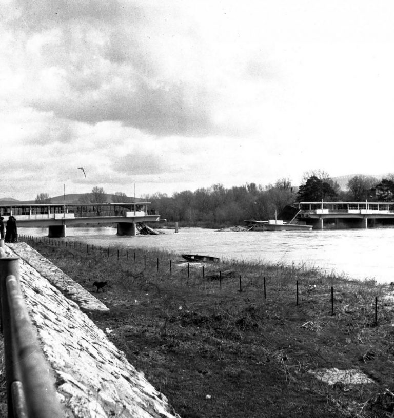 Nemeckému vojsku sa ešte pred odchodom z Piešťan podarilo zničiť oba mosty. V kronike mesta sa píše: „K dokonalému zničeniu došlo dňa 2. apríla 1945 ráno o 7. hodine. Pri tom sa použilo také množstvo výbušnín, že nielen most bol zničený, ale boli poškodené aj okolité vily. Po výbuchu obyvateľstvo húfne vyjde k mostu a pohnuto, takmer so slzami v očiach díva sa na trosky, prach a dym, ktoré zahaľujú celé okolie. V začatom ničení bolo pokračované. Zničili sa na poštovom úrade automatnú telefónnu centrálu, zničili budovy kasárenské, hangary, letište zorali traktormi a v noci z 3. na 4. apríla 1945 vyhodili do povetria krajinský most. Od väčšieho poškodenia podarilo sa zachrániť Ružový mlyn, kde sa uspokojili s tým, že zobrali remenné prevody zo strojov.“