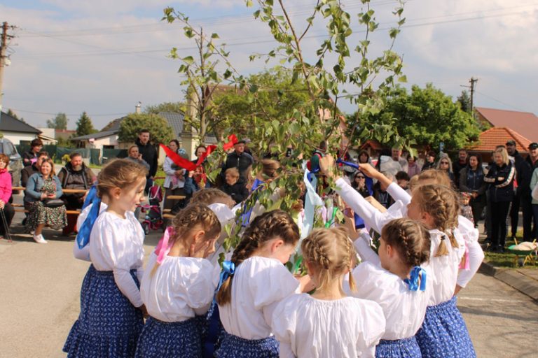 Ešte dopoludnia deti zo základnej s materskou školou vyzdobili máj stužkami. To aby o pol štvrtej popoludní, keď sa starosta Jozef Tkácz prihovoril k obyvateľom obce a s ľudovými tancami, spevmi a muzikou vystúpili malí speváci, hudobníci z miestnej základnej i materskej školy, a tiež talentovaní tanečníci z Cirkevnej základnej školy svätého Gorazda vo Vrbovom a hudobníci z Lusku, mohol pracovník miestnej poľnohospodárskej spoločnosti Granelam s technikou Manitou a za pomoci chlapov z dediny postaviť máj pred reštauráciou Sedliacka stodola. Starosta mal na starosti reťaz, ktorou bol máj zabezpečený, preto naskočil do lopaty nakladača a tá ho vydvihla do výšky.