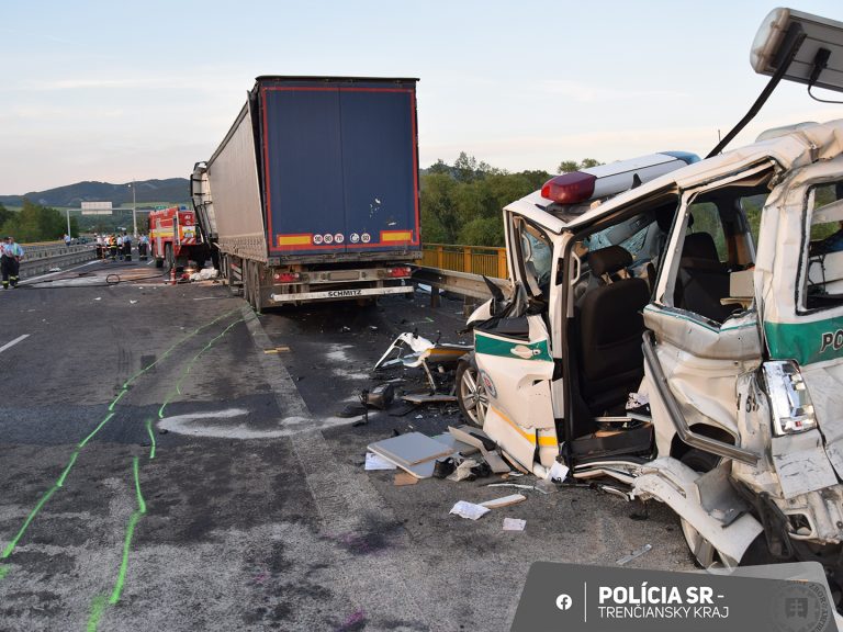 Dve autá Hasičského a záchranného zboru SR a jedno mýtnej polície boli v pondelok vyslané na diaľnicu v katastri obce Horná Streda v smere na Žilinu k horiacemu autu odstavenému na krajnici. Vodič nákladného auta podľa hovorkyne z doposiaľ presne nezistených príčin prešiel do pravej časti vozovky, kde narazil prednou časťou vozidla do odstaveného auta mýtnej polície. V ňom sedel 42-ročný úradník mýtnej jednotky. „Ten v dôsledku nárazu utrpel mnohopočetné zranenia a bol leteckou záchrannou službou transportovaný do nemocnice. Príslušníčka policajného zboru, ktorá v čase nárazu stála vedľa vozidla, utrpela ľahké zranenia, s ktorými bola prevezená do nemocnice,“ priblížila Kuzmová.