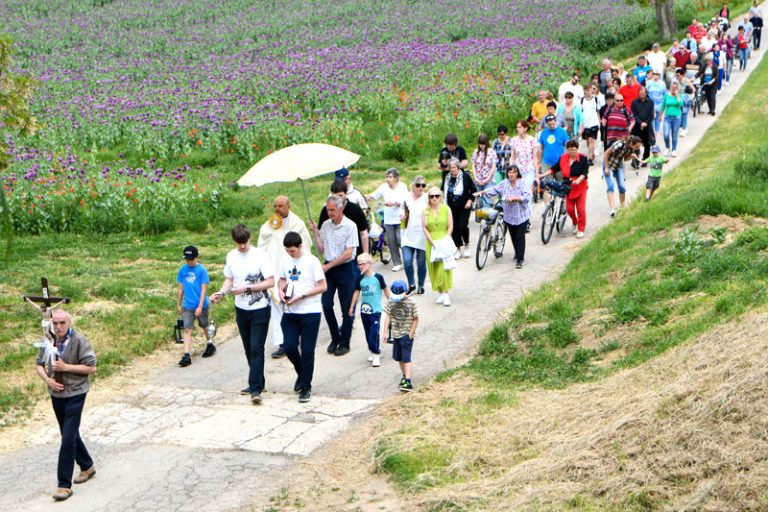 Vkusne vyzdobená kaplnka vďaka Jarmile, Vierke a Jarinke už očakávala procesiu. Farár Marián Díreš na oltárik položil monštranciu s Oltárnou sviatosťou a začala sa prosebná pobožnosť a svätenie. Organistka Inka so speváčkami Danielou a Miškou spievali a zapojili všetok ľud do nábožného spevu. Matka Tereza svojho času povedala, že najväčší odborníci na svete sú deti, to sa pri tejto príležitosti potvrdilo. Terezka, Henka, Marienka, Dávid, Niko, Andrej a Martin pohotovo a správne zorientovali farára, kde je východ, západ, sever a juh, a tak mohol požehnať polia, sady, záhrady a vinice na všetky svetové strany. Oslavnou piesňou Stotisíc ráz Ťa tu pozdravujeme, nebeská Kráľovná, patrónka zeme spevák Milan poďakoval Panne Márii za ochranu.