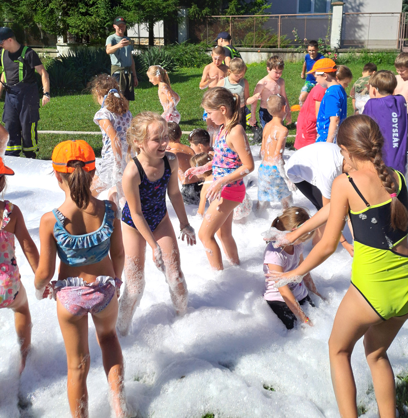 Horúci utorok prišli schladiť dobrovoľní hasiči z Moravian nad Váhom. Deti sledovali fascinujúce ukážky ich práce, prehliadku hasičskej techniky, vyskúšali si overaly či dýchacie prístroje a súťažili v hasení. Program vyvrcholil penovou párty a osviežujúcou „hasičskou“ oblievačkou v záhrade, kde sa všetci skvele zabavili.