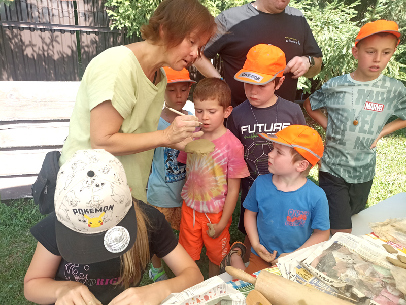 My sme si za deťmi zašli vo štvrtok 14. augusta popoludní. V blahodarnom tieni listnatých velikánov „mníšskej záhrady“, ktorá je len kúsok od futbalového štadióna, boli dve veľké partie detí s rodičmi i organizátormi tábora. Jednu sme si nazvali „rezbárska“ a druhú „modelársko-keramická“. Do tajomstiev umeleckého modelárstva zaúčala deti animátorka Simona Petrušová. Tie si podľa svojho výberu vyrábali z hliny rôzne predmety – kvety, misky, drobné keramikárske dielka, suveníry, ktoré si podpísali, aby potom, keď vyzrejú či sa vypália, mali pamiatku na pekné tvorivé chvíle.