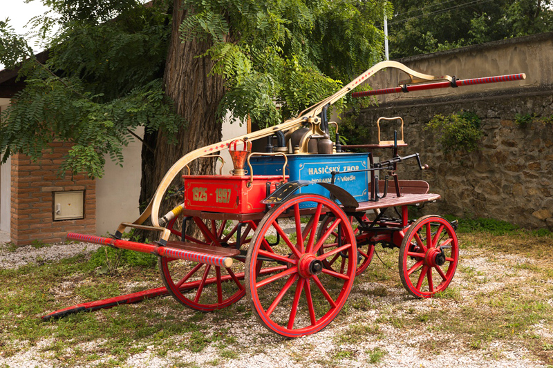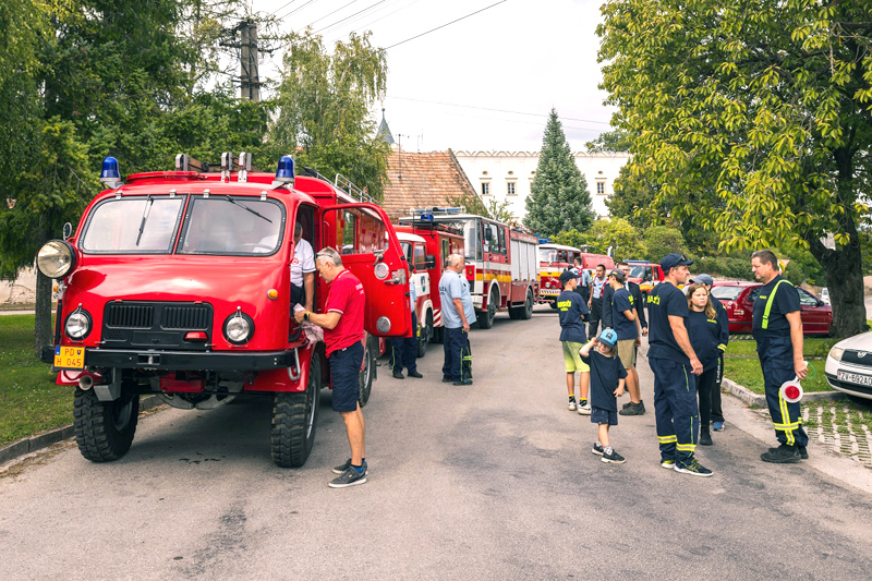 Po štvrťhodinovej okružnej jazde hasiči zaparkovali svoje vozidlá v kaštieľskom parku. Vedľa povojnovej techniky vystavili i historickú dvojpiestovú striekačku, ktorá bola objednaná v roku 1925 a dodaná o dva roky neskôr. Kým na požiarisko ju priviezol pár koní, čerpanie obstarávali hasiči ručne. Striekačka bola zreštaurovaná v roku 1997 a dlhoročne tvorila súčasť expozície Vojenského historického múzea v Piešťanoch.