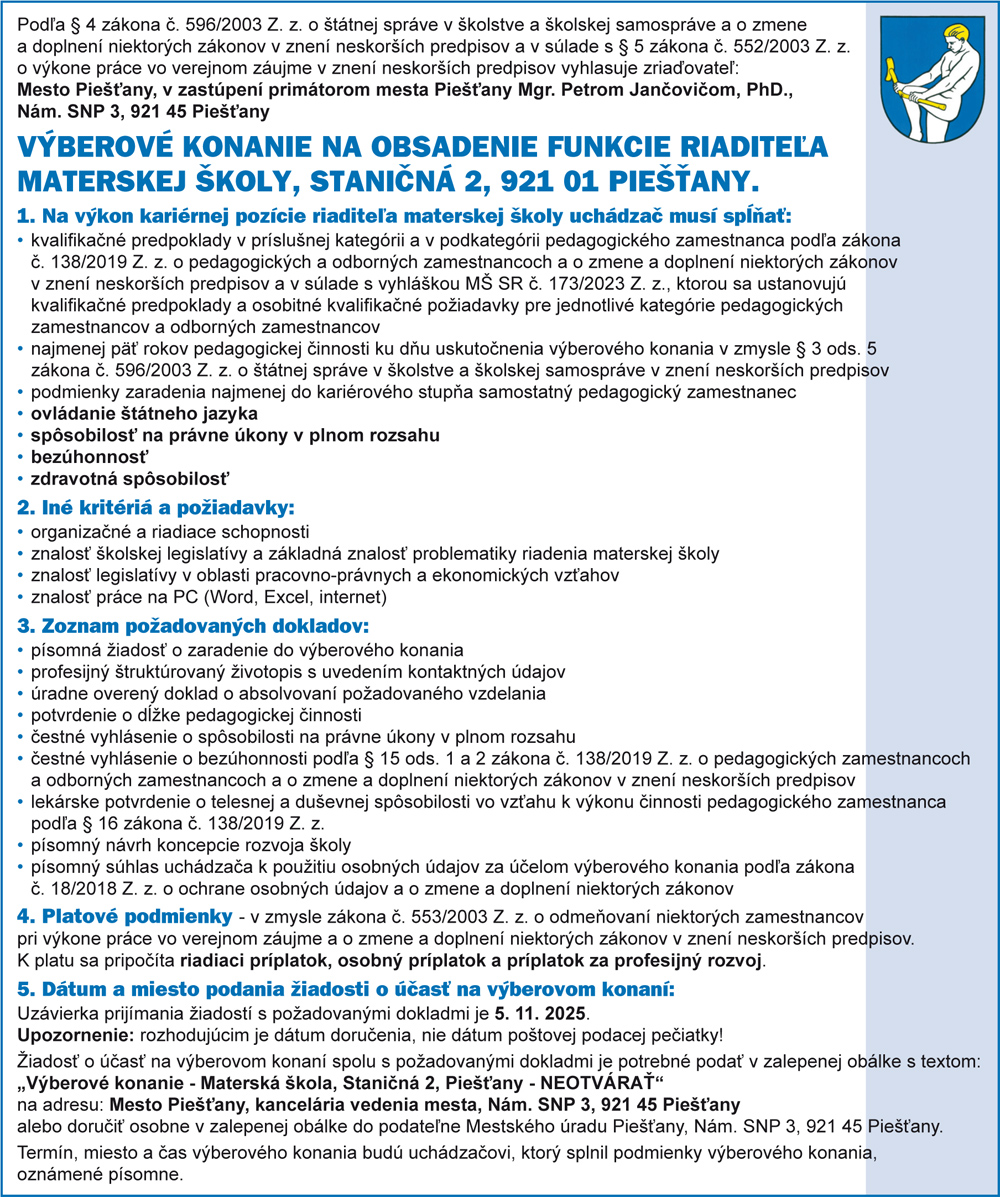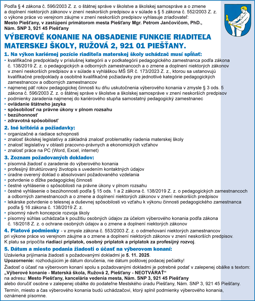 Dobré ráno, Piešťany! Dnes je utorok 14. októbra. Tento deň je Svetovým dňom normalizácie a Svetovým dňom starých rodičov. V Maduniciach sa 14.10.1907… 14.10.2025, 00:01 Dobré ráno, Piešťany!