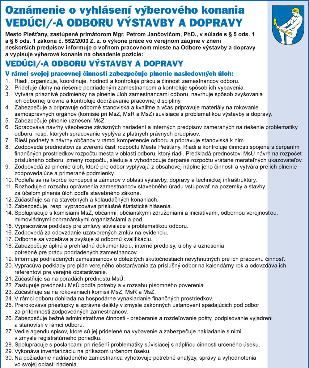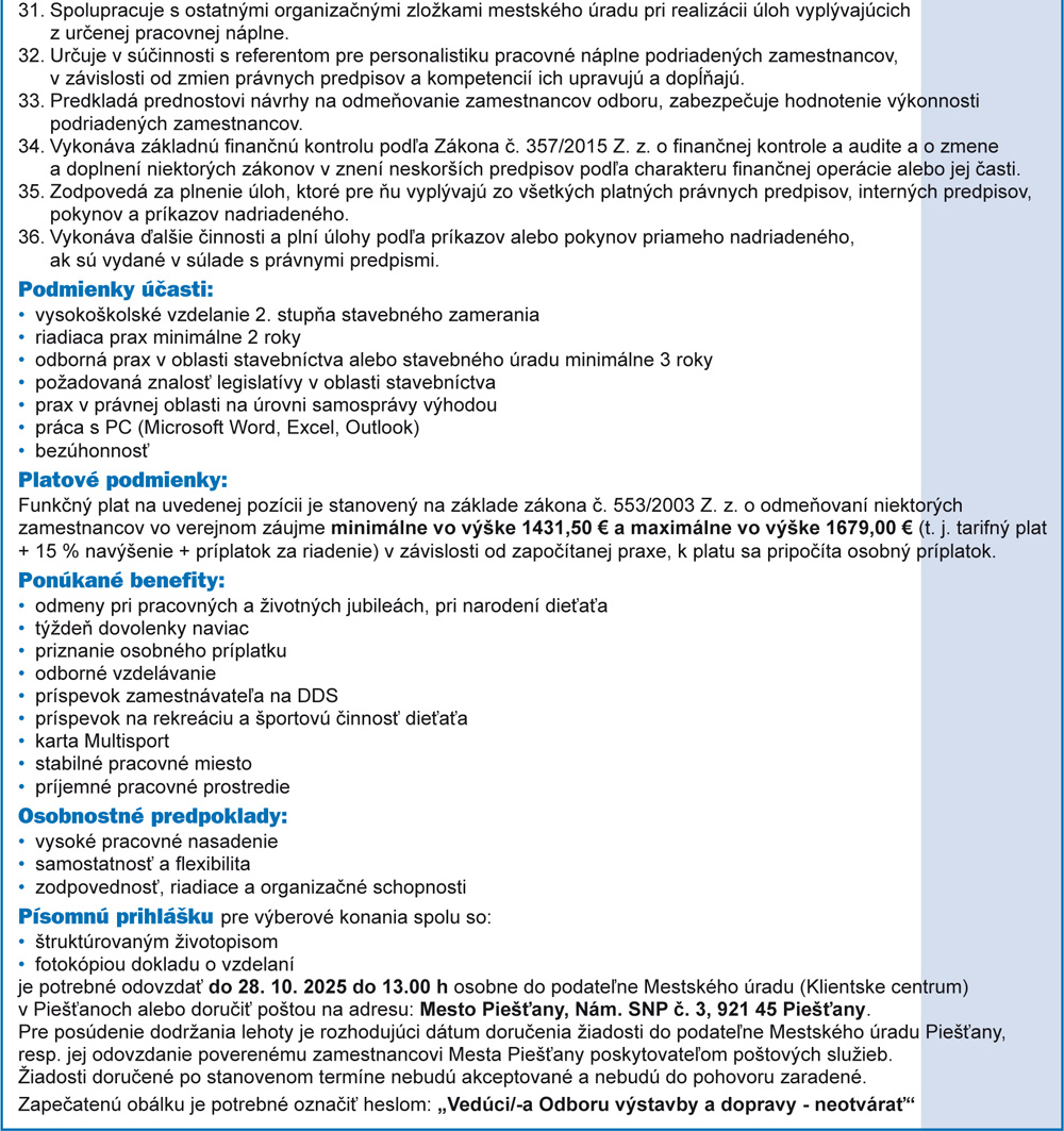 Mesto pokračuje v zmenách organizácie dopravy Mesto Piešťany po prvej fáze zmien organizácie dopravy, ktorá sa uskutočnila na prelome rokov 2023 a 2024 v širšom centre,… 15.10.2025, 00:01 Piešťany / Spravodajstvo
