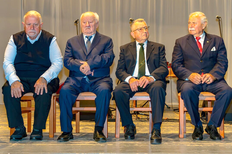 Cenu mesta Vrbové získali Silvester Boškovič (vľavo) a František Babuška (tretí zľava). Na pódiu s nimi sedia čerství držitelia Beňovského glóbusov, bývalí primátori Jozef Sabo a Ivan Borovský.