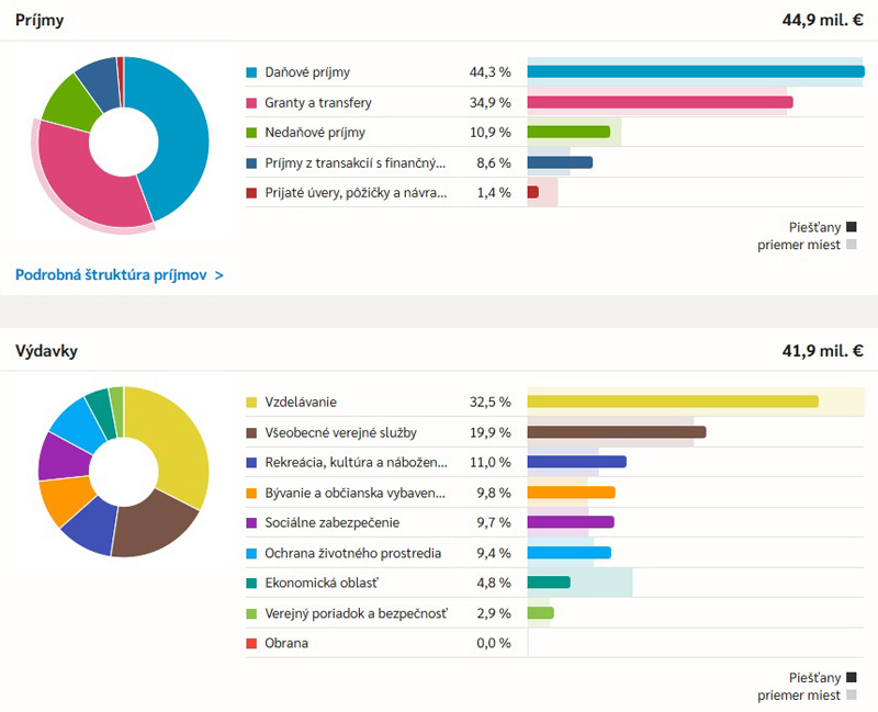 Piešťany podľa INEKO v hodnotenom roku 2024 hospodárili na strane príjmov so sumou 44,9 milióna eur, výdavky mesta tvorila suma 41,9 milióna.