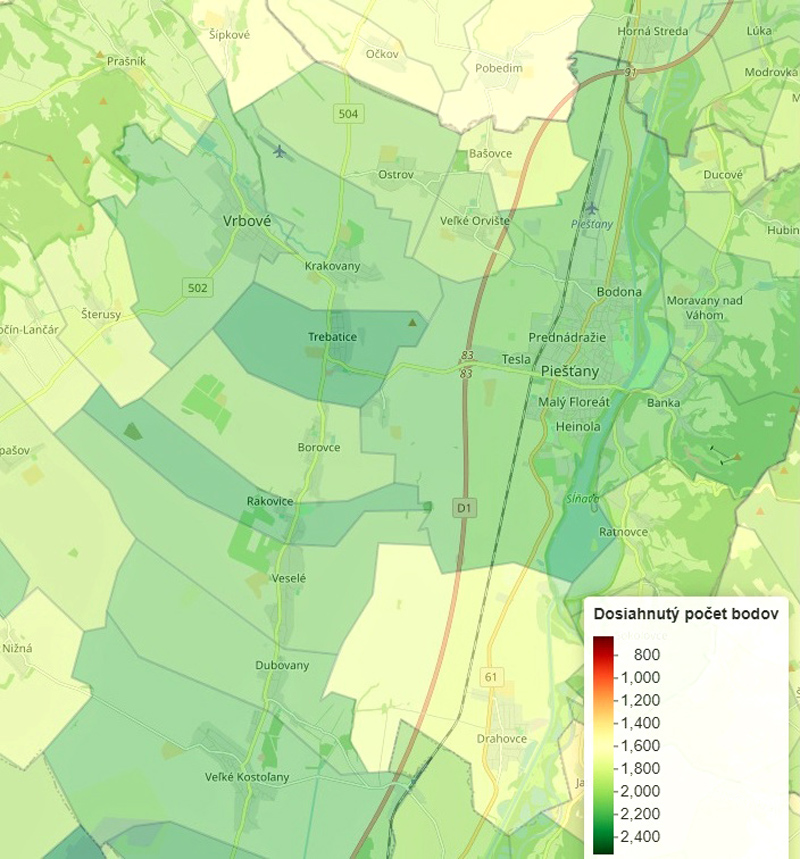 Mapa farebne zobrazuje kvalitu života v mestách a obciach. Zelená farba označuje najkvalitnejšie obce pre život s najvyšším počtom bodov.