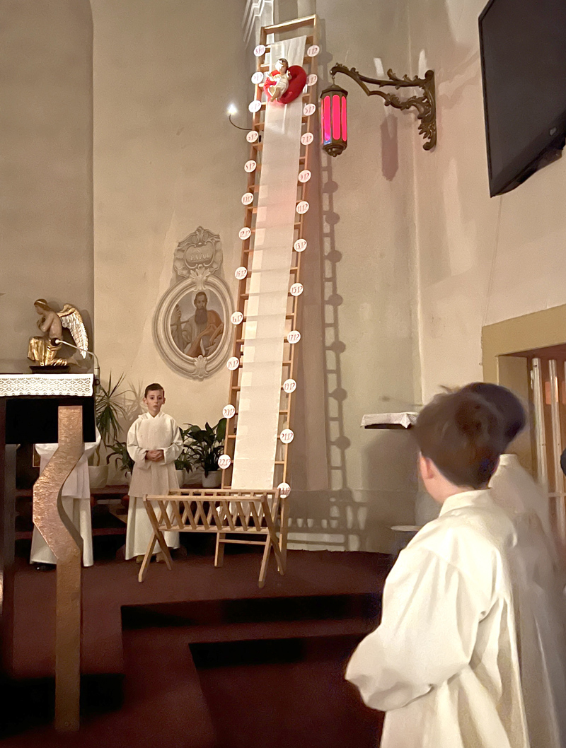Pri oltári sú pripravené jasličky pre Ježiška, ktorý každý deň symbolicky zostupuje o stupienok nižšie. Po omši sa deti presunuli do školskej jedálne, kde ich čakali raňajky od rodičov.