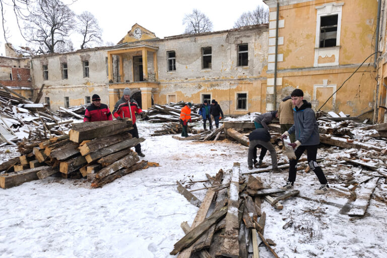 Robilo sa i napriek chladnému, mrazivému počasiu. „Brigádnici odpratávali sutiny, čistili starú tehlu, ktorá sa spätne použije, odpratávali starý zhodený hnilý krov. Bolo treba pripraviť – vyčistiť okolie celého kaštieľa, kam sa umiestni lešenie, z ktorého firma Luminor bude stavať nové stropy, krov a strešnú krytinu,“ upresnil Dóczy.