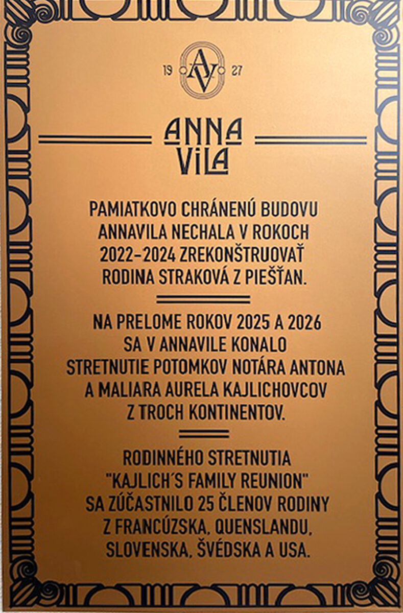 Na Annavile pribudla pamätná tabuľa pripomínajúca, že budovu nechala zrekonštruovať rodina Straková. Tabuľa ďalej oznamuje, že sa tam na prelome rokov 2025 a 2026 konalo stretnutie potomkov notára Antona, tvorcu Piešťan, a maliara Aurela Kajlichovcov z troch kontinentov, ktorého sa zúčastnilo 25 členov rodiny z Francúzska, Austrálie, Slovenska, Švédska a USA. Na stretnutí bol tiež zasadený pamätný strom – magnólia.