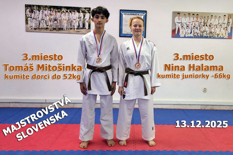 Na Majstrovstvách Slovenska dorastencov a juniorov sa o dve bronzové medaily postarali Tomáš Mitošinka v kumite dorastencov do 52 kg a Nina Halama v kumite junioriek do 66 kg.