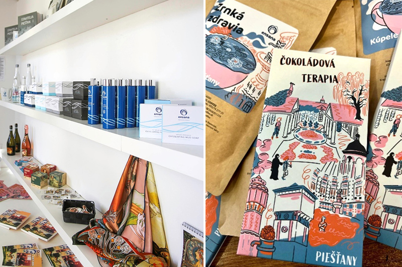 Po estetickom zážitku vás pozývame aj do nášho suvenír shopu, ktorý je súčasťou priestorov. Nájdete v ňom exkluzívny merch inšpirovaný Alfonsom Muchom, ako aj dizajnové predmety so symbolikou a grafikou mesta a Kúpeľov Piešťany.