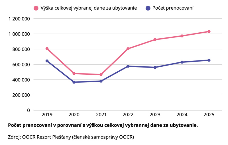 Z pohľadu vyzbieranej dane z ubytovania evidujú v Piešťanoch oproti roku 2024 nárast o šesť percent, členské samosprávy vyzbierali na dani z ubytovania viac ako milión eur. V roku 2025 sa ubytovalo v členských samosprávach Rezortu Piešťany vyše 133-tisíc návštevníkov. „V počte návštevníkov v porovnaní s rokom 2024 ide o dvojpercentný nárast a taktiež sme dosiahli nárast o jedno percento z predpandemického roka 2019,“ upresňuje Michal Bezák, predseda predstavenstva Rezortu Piešťany. Oproti roku 2024 prišlo aj k nárastu tržieb o 13 percent.