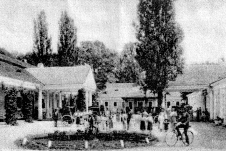Cyklista pred Napoleonskými kúpeľmi na pohľadnici vyrobenej pred rokom 1900. (Autor: archív autora)