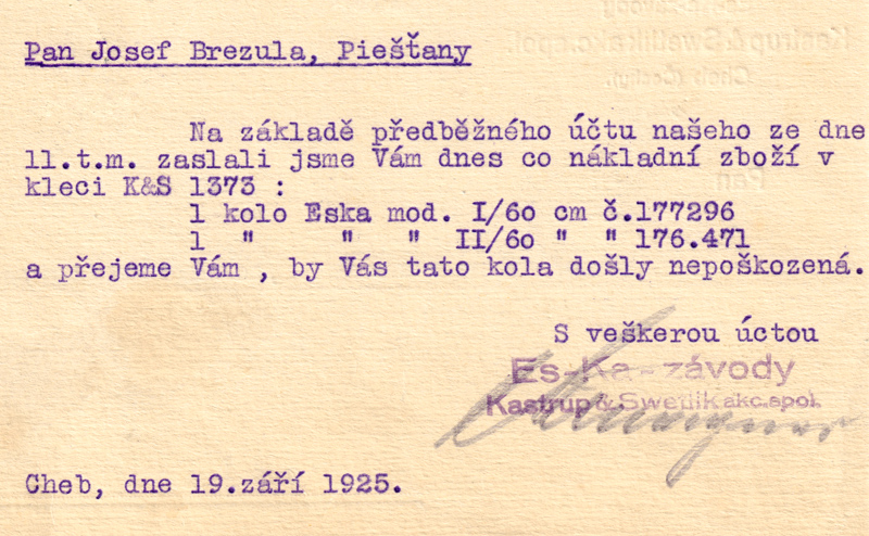 Mal som teda ešte jednu možnosť. Hrabať sa v starých listinách, fotografiách, pohľadniciach a podobných „pamätihodnostiach“. A tam som predsa niečo vylovil. Predtým, než napíšem čo, pripomeniem dobu na prelome 19. a 20. storočia. Či to bolo za monarchie alebo 1. ČSR, kúpiť bicykel nebola lacná záležitosť (a už opäť nie je). Nemohol si ho kúpiť každý, kto ho chcel a potreboval.