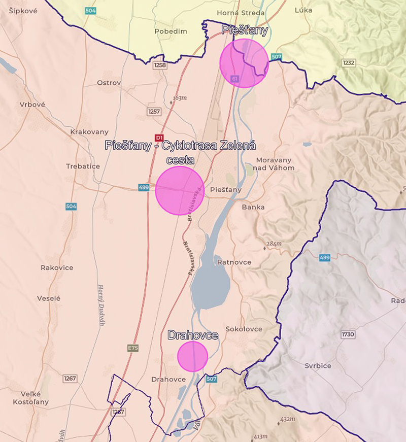 V piešťanskom regióne má kraj umiestnené tri ščítače prejazdov. Najviac ich zaznamenal sčítač na cykloceste z piešťanskej Bodony smerom na Hornú stredu, kde denne v priemere prejde 293 cyklistov a v tomto roku ich bolo už takmer osemtisíc. Hneď za ním v počte prejazdov je Zelená cesta z Piešťan do Vrbového z denným priemerom 245 cyklistov, pričom od začiatku roka ich bolo viac ako sedemtisíc. Cykloščítač na hati v Drahovciach zaznamenal denne v priemere 102 cyklistov a od začiatku roka ich bolo už vyše tritisíc.